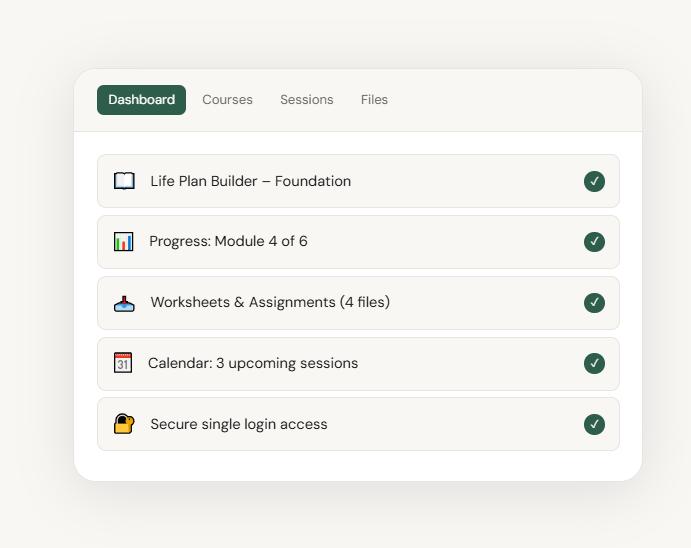 Life Plan Builder courses, guided group sessions, and personalized 1‑on‑1 coaching — all inside one seamless student platform.